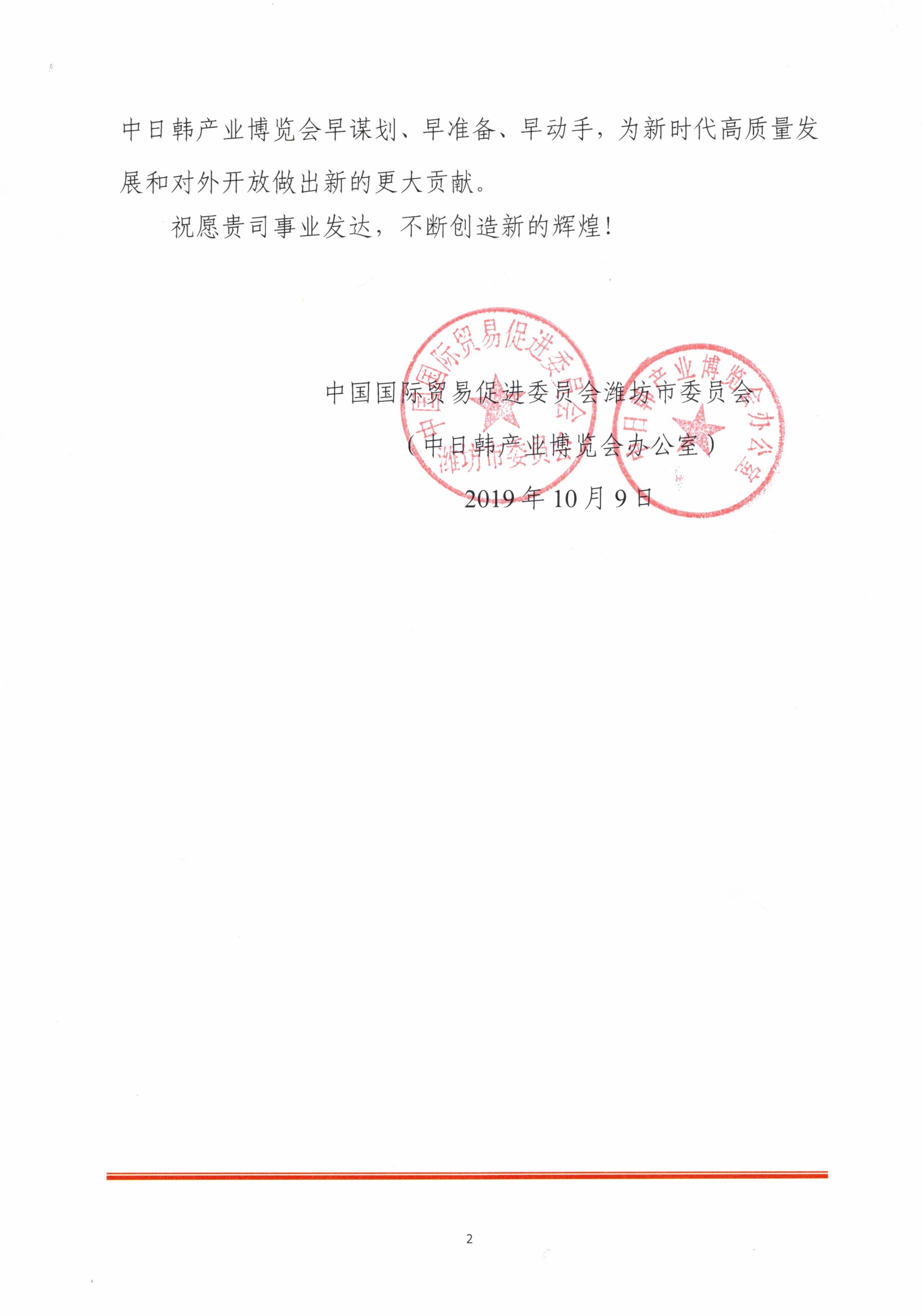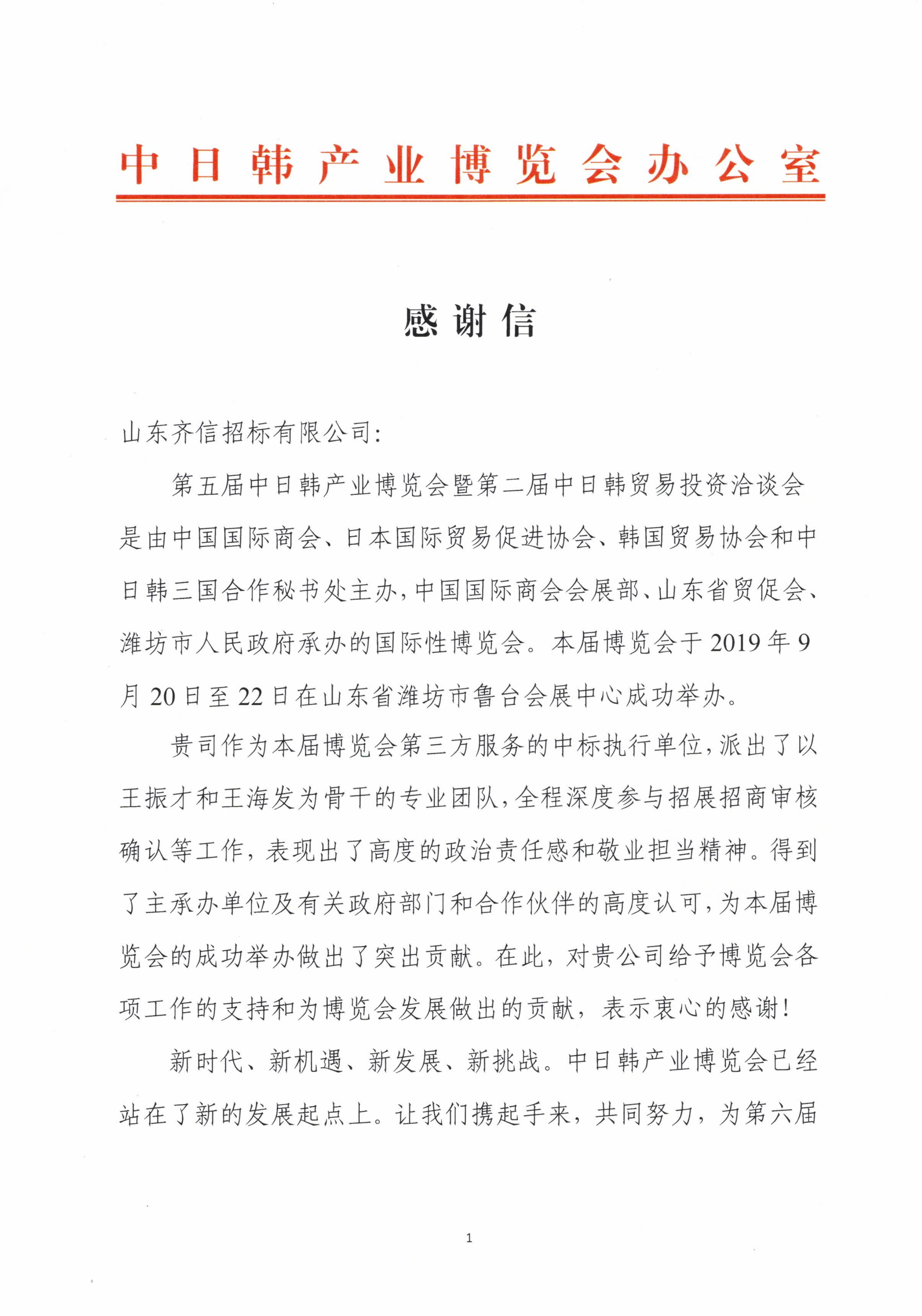 日前,齊信收到來自中日韓產(chǎn)業(yè)博覽會(huì)辦公室發(fā)來的感謝信,對齊信給予博覽會(huì)各項(xiàng)工作的支持及付出的努力表示衷心感謝。9月22日,第五屆中日韓產(chǎn)業(yè)博覽會(huì)暨第二屆中日韓貿(mào)易投資洽談會(huì)圓滿落幕。齊信作為本屆博覽會(huì)第三方服務(wù)的中標(biāo)執(zhí)行單位,全程深度參與了招展招商審核確認(rèn)等工作。齊信專業(yè)的服務(wù)團(tuán)隊(duì)和敬業(yè)擔(dān)當(dāng)精神得到了主辦單位及有關(guān)政府部門的高度認(rèn)可。