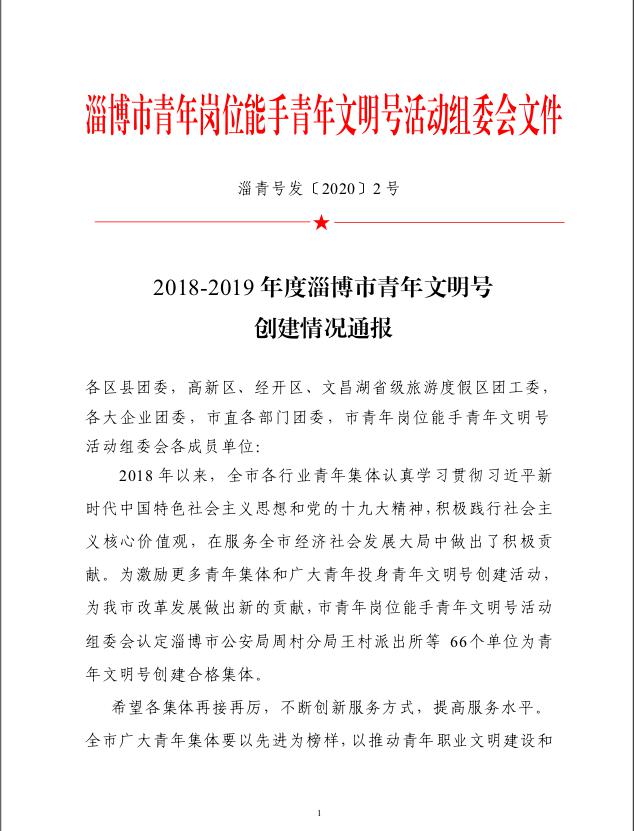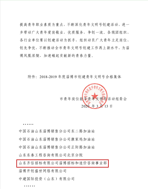 近日,共青團(tuán)淄博市委下發(fā)《2018-2019年度淄博市青年文明號創(chuàng)建情況通報(bào)》(淄青號發(fā)【2020】2號),山東齊信招標(biāo)有限公司淄博招標(biāo)采購與造價(jià)咨詢事業(yè)部榮獲淄博市“青年文明號”榮譽(yù)稱號。