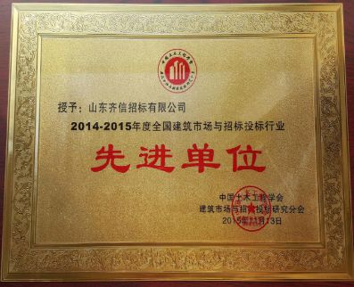 2015年,11月13日,在中國(guó)土木工程學(xué)會(huì)建筑市場(chǎng)與招投標(biāo)研究分會(huì)開(kāi)展的2014-2015年度“全國(guó)建筑市場(chǎng)與招標(biāo)投標(biāo)先進(jìn)單位”評(píng)選活動(dòng)中,經(jīng)各省、自治區(qū)、直轄市相關(guān)部門(mén)評(píng)選推薦并報(bào)中國(guó)土木工程學(xué)會(huì)建筑市場(chǎng)與招標(biāo)投標(biāo)研究分會(huì)評(píng)審,山東齊信招標(biāo)有限公司被評(píng)為“先進(jìn)單位”稱(chēng)號(hào)。