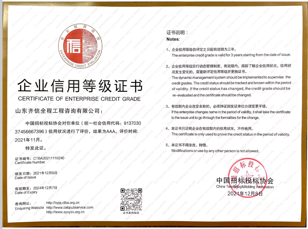 2021年12月,中國招標(biāo)投標(biāo)協(xié)會發(fā)布《招標(biāo)代理機(jī)構(gòu)2021年信用評價(jià)結(jié)果公示名單》,齊信獲評2021年招標(biāo)代理機(jī)構(gòu)信用評價(jià)AAA級企業(yè)(最高等級)。