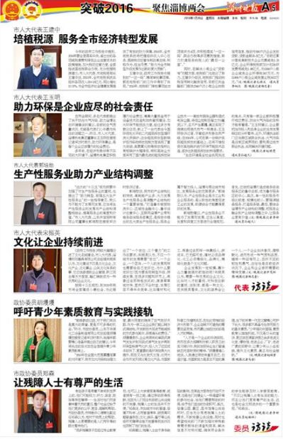 2016年1月16日、17日,第十一屆淄博市政協(xié)委員會(huì)第五次會(huì)議、第十四屆人大五次會(huì)議相繼召開。董事長(zhǎng)郭培勛作為市人大代表、總經(jīng)理王俊作為市政協(xié)委員分別參加了會(huì)議。會(huì)上,公司董事長(zhǎng)郭培勛接受淄博晚報(bào)專訪,結(jié)合“十三五”規(guī)劃綱要,提出了“產(chǎn)業(yè)性服務(wù)業(yè)不能為了發(fā)展而發(fā)展,應(yīng)當(dāng)從高度、長(zhǎng)度和深度三方面進(jìn)行合理規(guī)劃。首先,應(yīng)該把淄博打造成商務(wù)咨詢服務(wù)區(qū)的魯中總部,成為魯中服務(wù)區(qū)的中心。其次,單一性的服務(wù)市場(chǎng)比較差,規(guī)模也較小,要強(qiáng)調(diào)鏈條服務(wù),打造服務(wù)鏈。最后,要結(jié)合淄博市產(chǎn)業(yè)結(jié)構(gòu)的調(diào)整,把服務(wù)業(yè)融合到產(chǎn)業(yè)結(jié)構(gòu)調(diào)整之中,讓服務(wù)業(yè)更有價(jià)值”的建議。