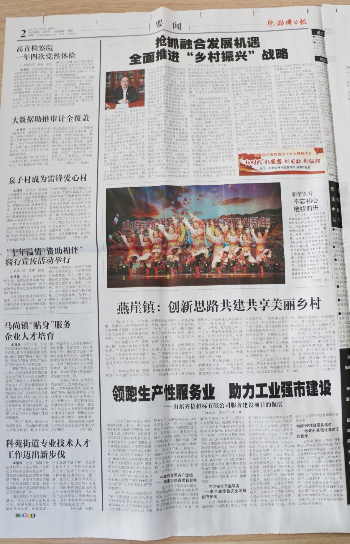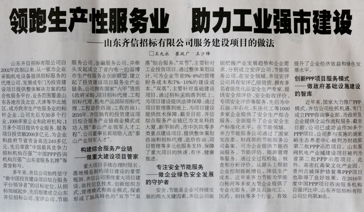 2017年11月13日,《淄博日?qǐng)?bào)》用大幅版面對(duì)山東齊信招標(biāo)有限公司服務(wù)進(jìn)行了報(bào)道,高度肯定了公司的服務(wù)建設(shè)項(xiàng)目的做法。