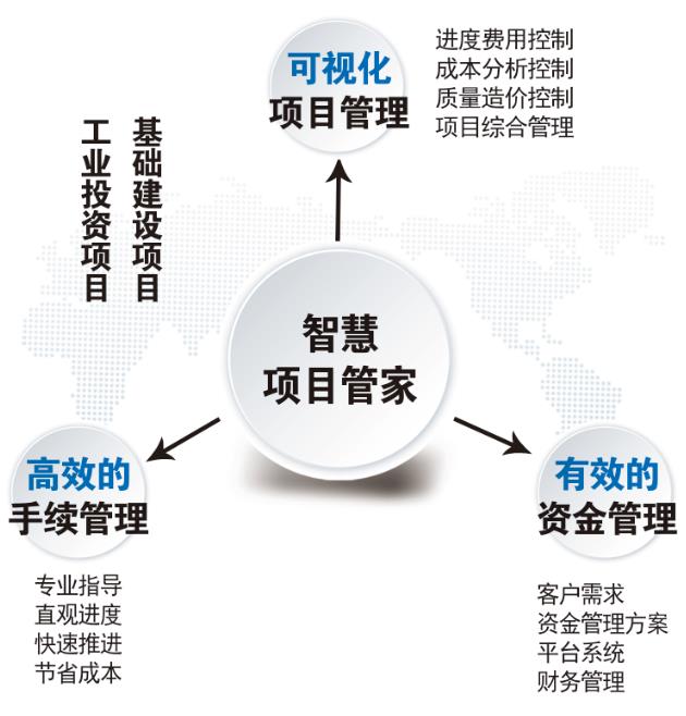 智慧項目管家服務平臺是結(jié)合項目建設中的各個痛點,圍繞投資建設項目實施過程中投資、質(zhì)量、進度、安全等多方面的問題,通過創(chuàng)新服務模式,集手續(xù)管理服務、項目建設管理、資金使用管理等功能為一體的可視化“大數(shù)據(jù)” 綜合服務平臺。